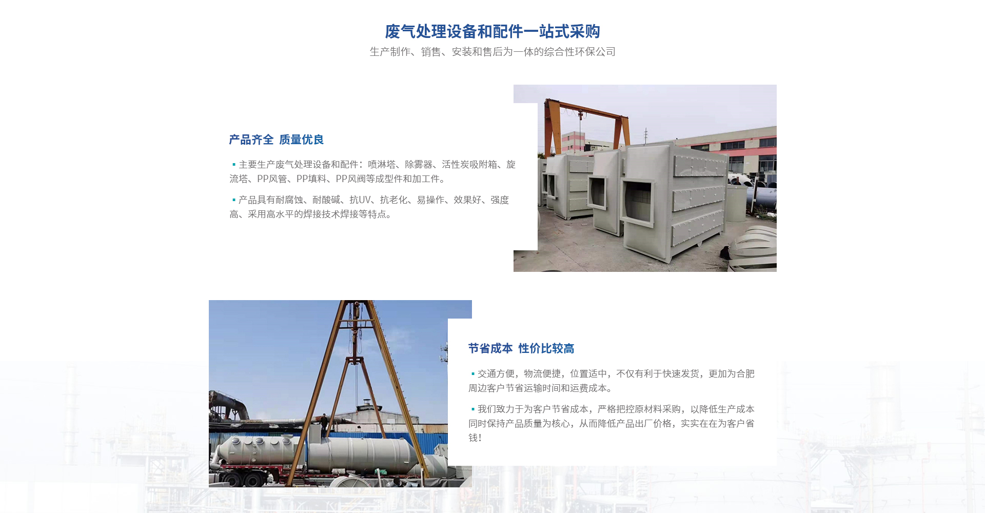 合肥熙誠環保科技有限公司是熙誠環保合肥分公司,是一家集產品生產制作、銷售、安裝和售后為一體的綜合性環保公司。主要生產廢氣處理設備和配件:噴淋塔、除霧器、活性炭吸附箱、旋流塔、PP風管、PP填料、PP風閥等成型件和加工件,產品具有耐腐蝕、耐酸堿、抗UV、抗老化、易操作、效果好、強度高、采用高水平的焊接技術焊接等特點;滿足客戶一站式采購的要求。廣泛應用于電子業、化工業、醫藥業、紡織業、橡塑業、汽車業、...